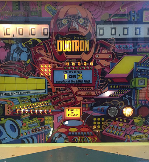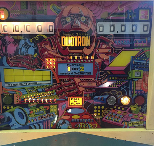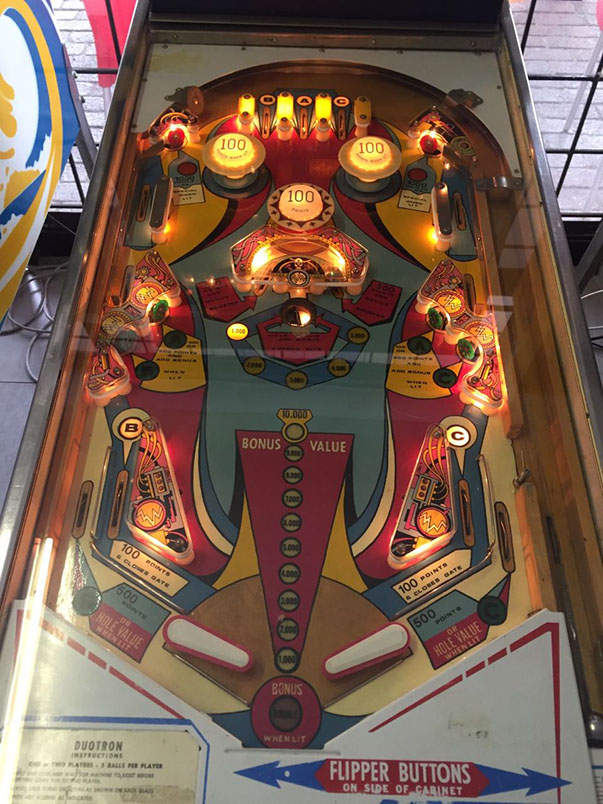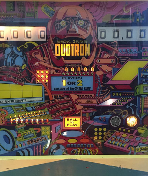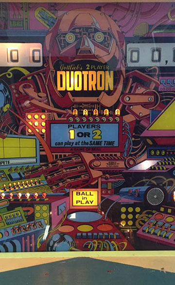 Duotron is a pinball machine from September 1974, manufactured by D. Gottlieb & Co., only just over 2500 units manufactured by Gottlieb back in the day. This is a very neat 2 player pinball machine, a must see. Works perfectly, serviced. Legs and door have been recently chromes.